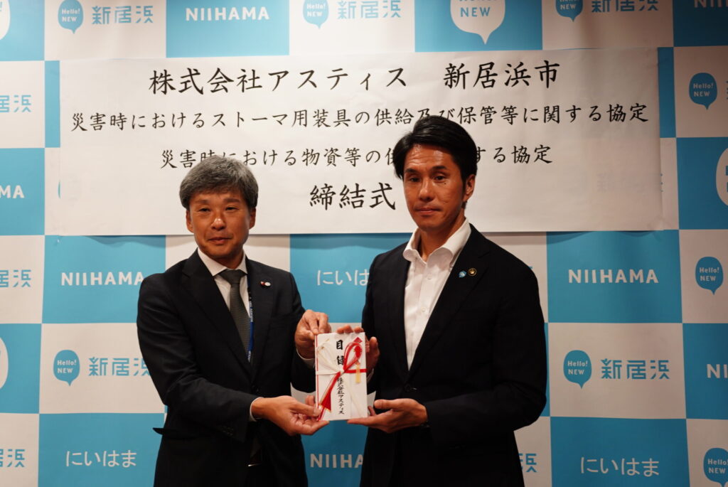 2025年9月12日、愛媛県新居浜市役所にて関係者参列のもと、「災害時におけるストーマ用装具の供給及び保管等に関する協定」「災害時における物資等の供給に関する協定」の締結式が執り行われました。