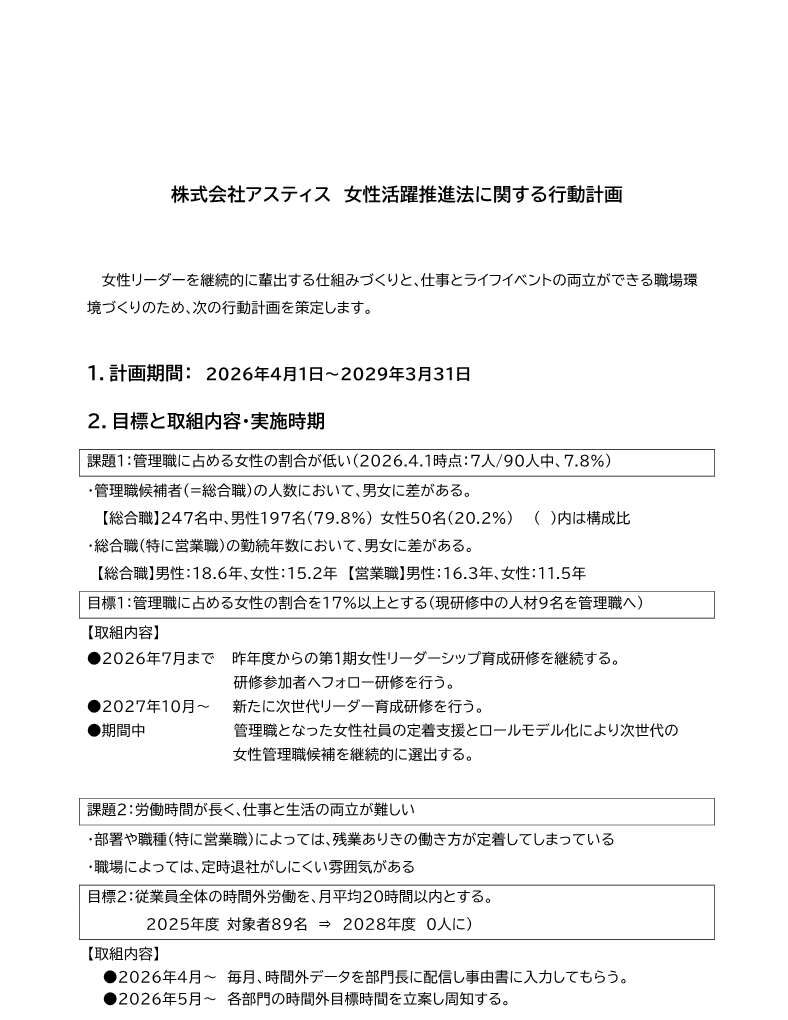 株式会社アスティスは、女性の職業生活における活躍の推進に関する法律に基づき、